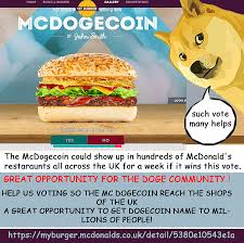 McDonalds au Royaume-Uni organise un concours qui permet aux utilisateurs de créer et de soumettre leurs propres hamburgers. Inutile de dire que la communauté Dogecoin a pris acte très rapidement. La proposition actuelle est un hamburger appelé McDogecoin qui utilise une liste coloré d'ingrédients, comprenant du boeuf, bacon, laitue, fromage, nachos, des oignons frits croustillants, sauce salsa épicée, et un petit pain de fromage sur le dessus.